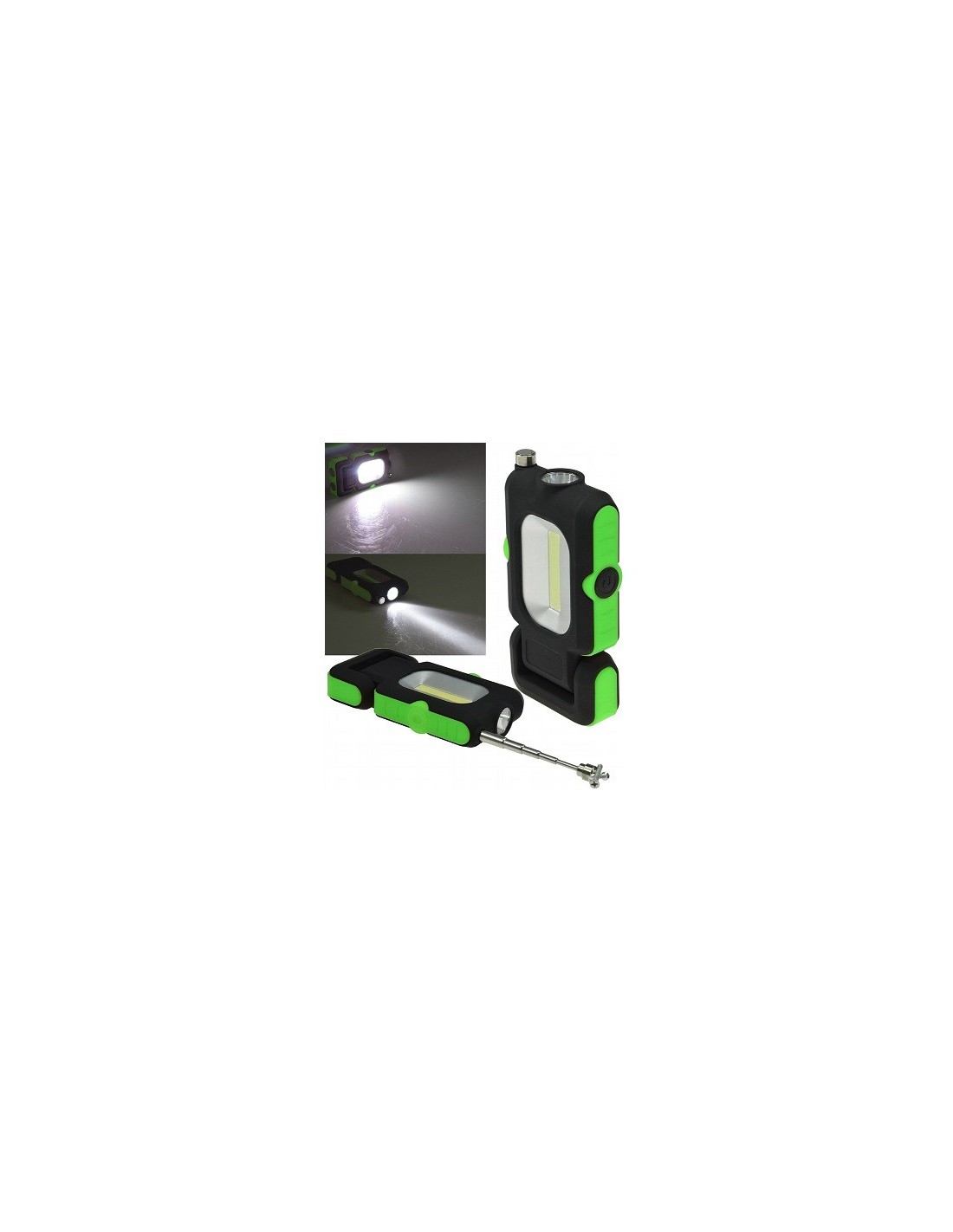 Multifunktionale LED-Arbeitsleuchte mit sehr heller 3Watt COB LED sowie 1Watt LED-Taschenlampe mit Haken und Magnetfuss. Griff dreh- & schwenkbar - so haben Sie Licht genau dort, wo Sie es brauchen. 2 Helligkeitsstufen. Ergonomische und griffsichere Softgummi-Beschichtung. 25cm ausziehbares Teleskop-Pickup Magnet-Werkzeug zum Aufheben von z.B. Schräubchen usw. 180 Grad schwenkbarer Fuss mit 2 Magnethaltern. LED-Arbeitsleuchte "CAL-COB Flexi", 3W und 1W, 4500K, 220 Lumen, Haken, Magnethalter, Teleskop, 12.5 x 6 x 2.5, gruen/schwarz, Taschen- und Arbeitslampe.