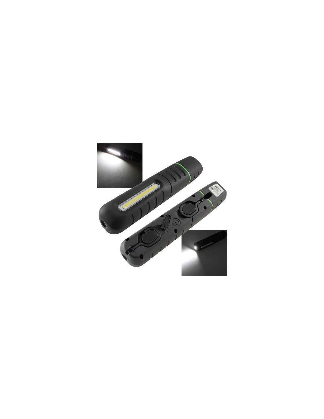 Darf es ein bisschen mehr sein? Die LED-Arbeitsleuchte bietet richtig gutes Licht in zwei Helligkeitsstufen. Der dreh - und schwenkbare Griff sorgt immer für die passende Beleuchtung in unterschiedlichen Arbeitssituationen. Griff dreh-schwenkbar. Zwei kräftige Magnethalter und ein praktischer Haken halten die Leuchte, wenn beide Hände gebraucht werden. Die Arbeitsleuchte wird mit einem Akku betrieben und verfügt über einen Batterieindikator. Zusätzlich Taschenlampe 3W/160 lm. LED-Stableuchte mit Akku "FlexiLED 900", 10W und 3W, 4500K, 800 Lumen, Ladegeräte, Haken, schwenkbar, 24 x 51 x 5, gruen/schwarz, Taschen- und Arbeitslampe.