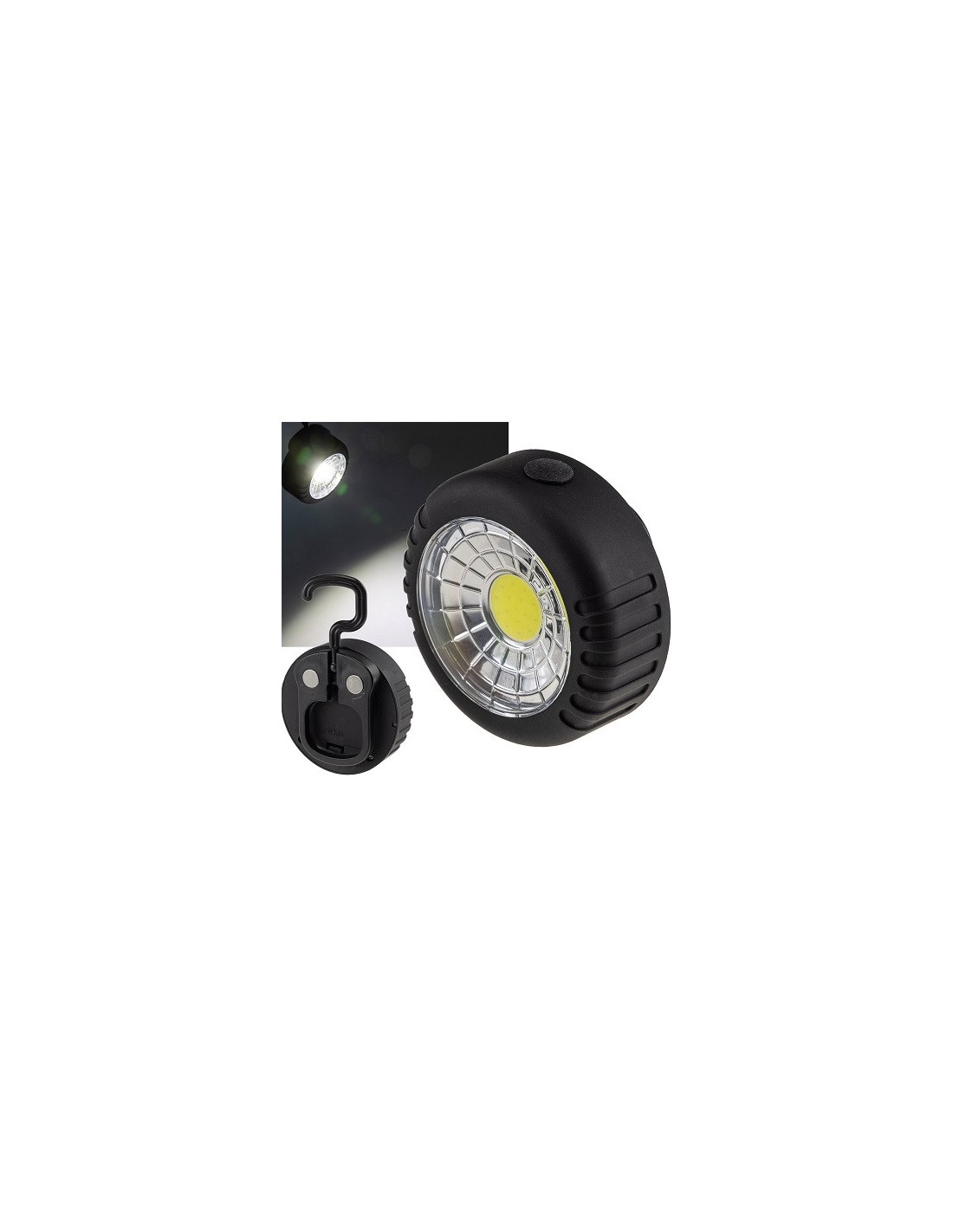 Universell verwendbare LED Batterie-Arbeitsleuchte mit drehbarem Magnethalter und 45mm Haken. Ideal als Notleuchte im Auto, Caravan und als Arbeitslicht für Heimwerker und Handwerker. Gummiertes Gehäuse für festen Halt. Seitlicher Drucktaster. Betrieb 3 x Microbatterie/AAA 1.5V (nicht dabei). Lichtstrom 86lm. Leistung 1W. Lichtfarbe weiss. LED Arbeitsleuchte mit Magnet, "COB100", 1W, COB, 6000K, 90Lm, mit Haken und Magnethalter, 7.5 x 3.5, schwarz, Arbeitsleuchte.