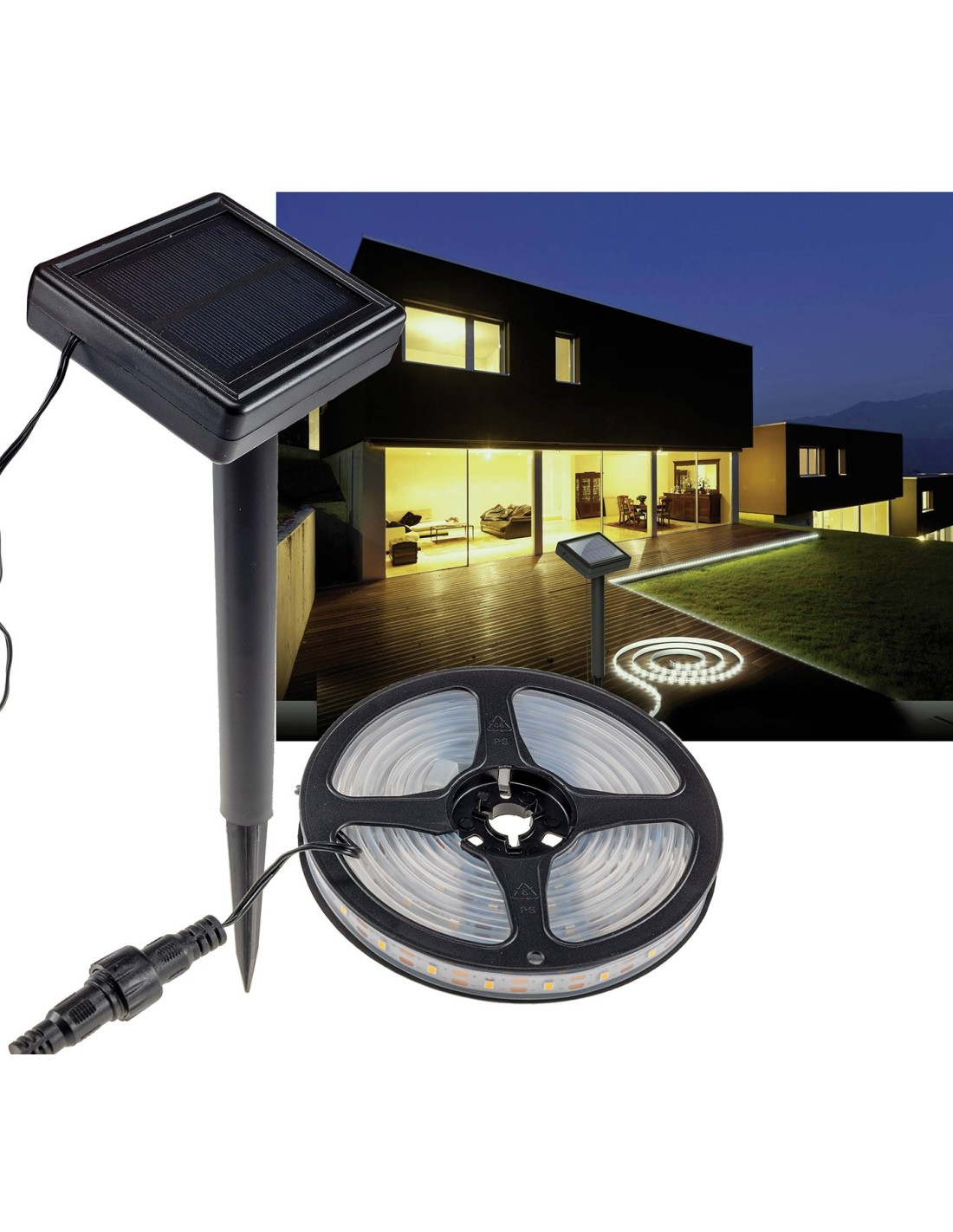 LED Solar LED-Stripe 3m, warmweiss 3000K IP44, Dämmerungssensor. Mit 1.5m Zuleitung von Solar zum 3m Led Streifen.