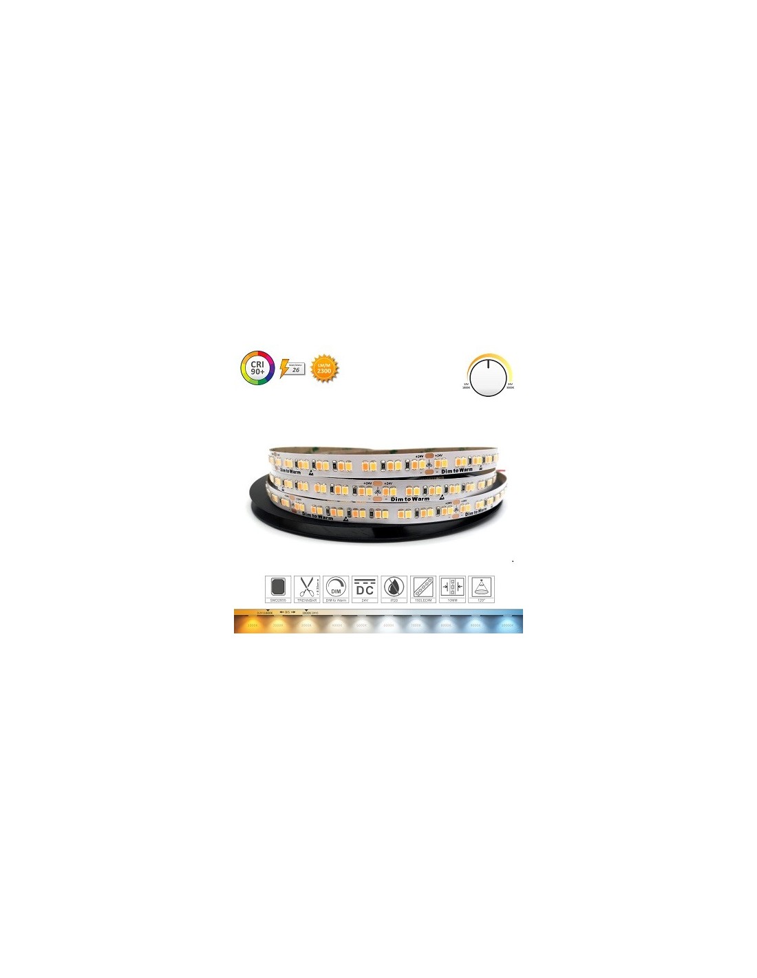 Dieser LED-Streifen verändert seine Lichtfarbe durch das Dimmen von 24V (3000K - Warmweiss) auf 12V (1800K Ultra-Warmweiss) und verhält sich durch dieses Prinzip ähnlich wie eine Glüh- oder Halogenlampe. Es gibt diesen tollen "D2W" LED-Streifen als Meterware. Maximale Leuchtkraft 24V/26W/max. 2'300Lm/m. Ideal für den spezial Einsatz im Wohnzimmer, Wintergarten, Schaufenstern oder für den Umbau Ihrer alten Lampe. LED-Stripe, Streifen, "D2W - Dim to Warm" Premium LED-Streifen SMD2835 - 24V | 192LEDs/m | 2300lm/m | 24V DC - 1800K - UWW bis 3000K - WW.