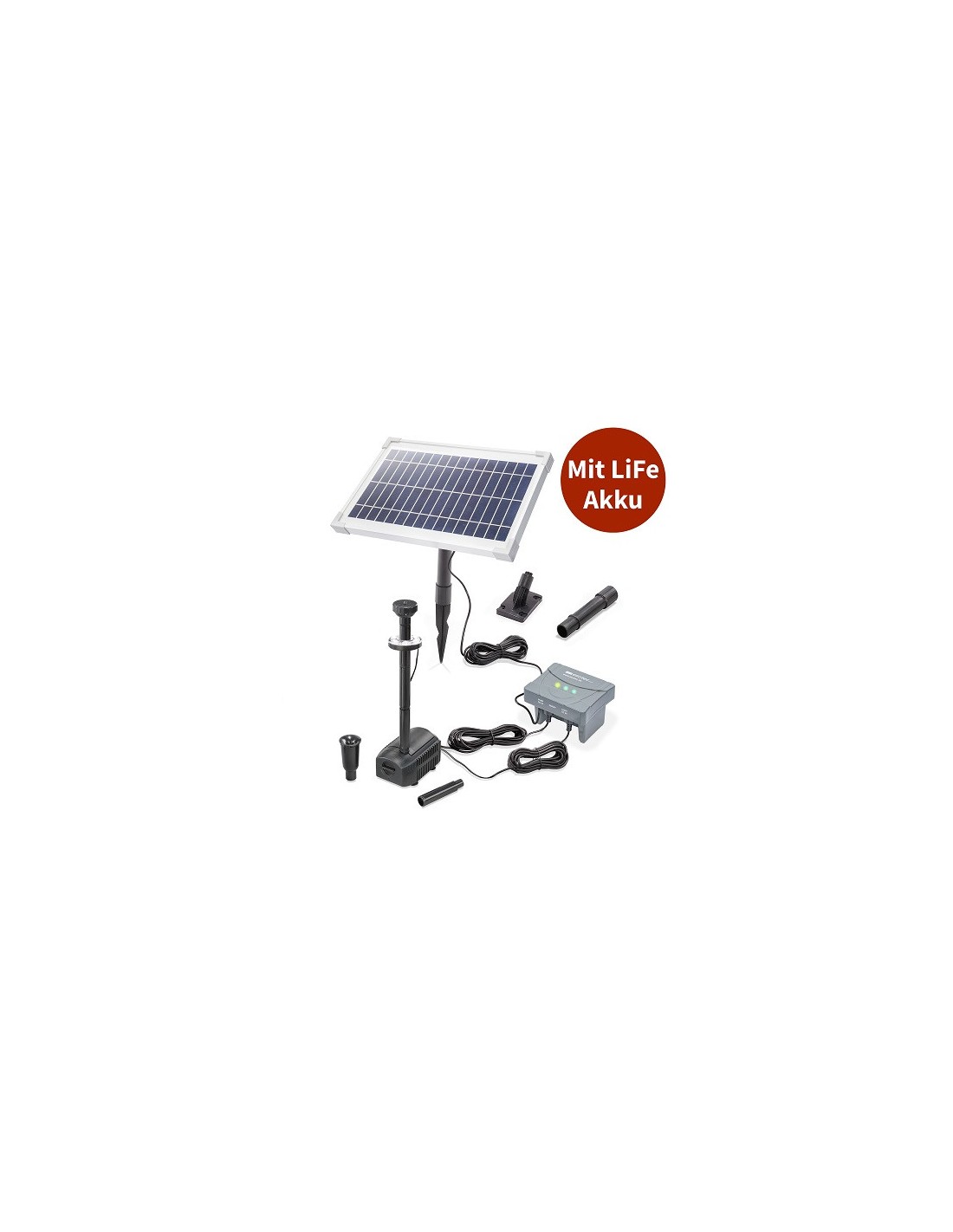 Lieferumfang: 6.4V Pumpe 400l/h, 8.16V Solarmodul 8Wp, LiFe Akku 6.4V/4Ah, 4 Steigrohre, 4 unterschiedliche Düsenaufsätze und div. Zubehör.