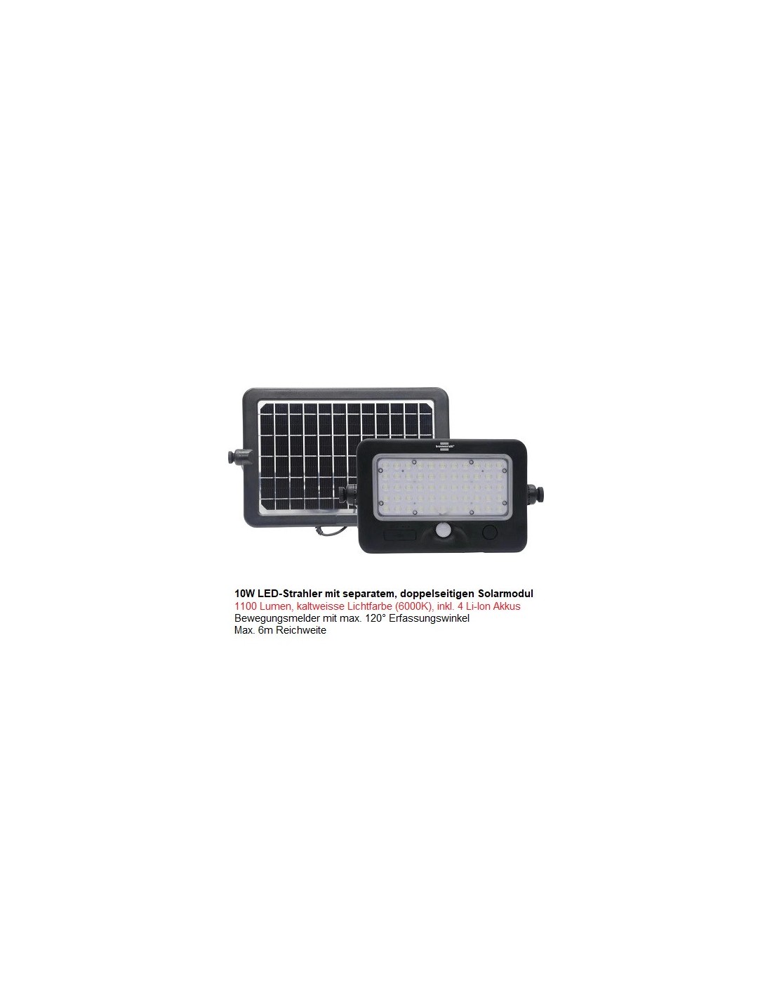 BrennenstuhlLED-Solar Scheinwerfer "SOL-ML-1000", mit PIR, Sensor, 10W, 6000K, 1'100Lm, inkl. Solarpanel und Akku, wetterfest