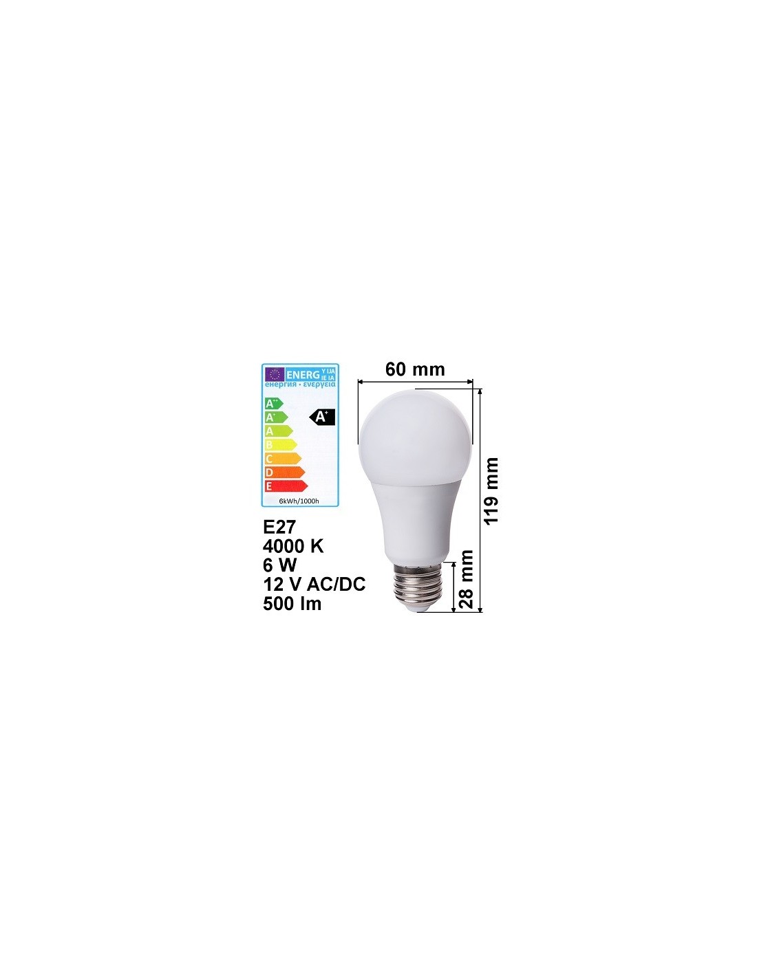 Niedervolt 12V/24V AC/DC E27 LED-Leuchtmittel mit dem grossen Schraubgewinde finden Sie im Photovoltaik-, Solar-, Camping- oder KFZ und Boot Bereich. Ihr vielseitiger und universeller Einsatz ist einfach einzigartig und fast unvergleichlich. Diese tollen LED energiesparenden Lampen finden Verwendung im Garten, im Wochenendhaus, im Wohnmobil, auf einem Boot usw. Dank der spez. Niedervolt 12V/24V Technik auch für den direkten Batterie- und Solarbetrieb geeignet. LED Lampe, Birne, E27, 12V DC, 6W, 12V, 4000K, 500Lm, 200 Grad, Ersatz 50W, 12 x 6, PVC/Thermoplast, 12V AC/DC.