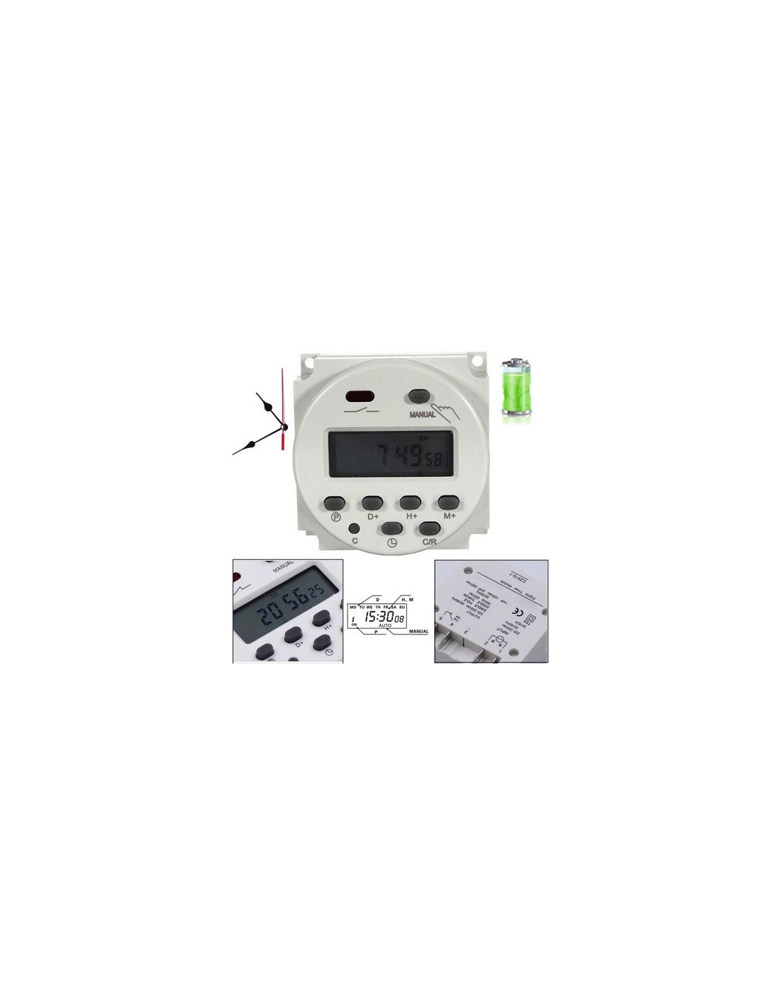Preiswerte digitale Indoor Tageszeitschaltuhr für die Zwischenstecker-Montage mit max. 17 Schaltprogrammen pro Woche. Potentialfreier Ausgang für 12V DC oder 230V AC. Mit eingebautem Akku bei Stromausfall. Digitale Indoor-Zeitschaltuhr, Manuell Ein-/Aus, Max. 8/16A Schaltstrom. Digitale 7 x 24 h Zeitschaltuhr, Ein/Aus Schalter, Elektronisch, Indoor, kürzeste Schaltzeit 1 Min., T12-T13, weiss, Kunststoff, 1 Min. Takt.