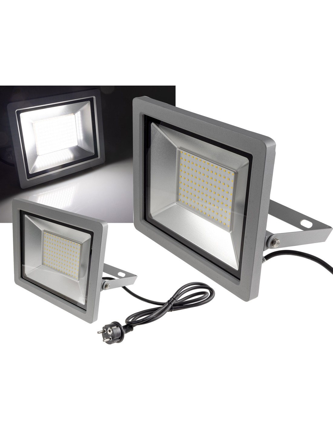 Mit diesem tollen und kostengünstigen 100W Scheinwerfer ersetzen Sie im Nu, Ihren alten Scheinwerfer auf die neue LED Technologie. Die Strahler Fluter verfügen über 126 sehr leistungssarke LEDs. Es gibt sie in den verschiedensten Grössen, Lichtfarben und Leistungen. Mit sehr sehr ansprechendem Wirkungsgrad und einfachem Design. Sie werden Ihnen gute Dienste leisten für die Beleuchtung von Garten, Hof oder Garage. LED Scheinwerfer SlimLine "CTF-SLT99NW", 100W, 230V, 4000K, 9'200Lm, IP65, silber, 31.0 x 26.0 x 5, GRAU, Aluminium, 1.5m Anschlusskabel (H05-NF).